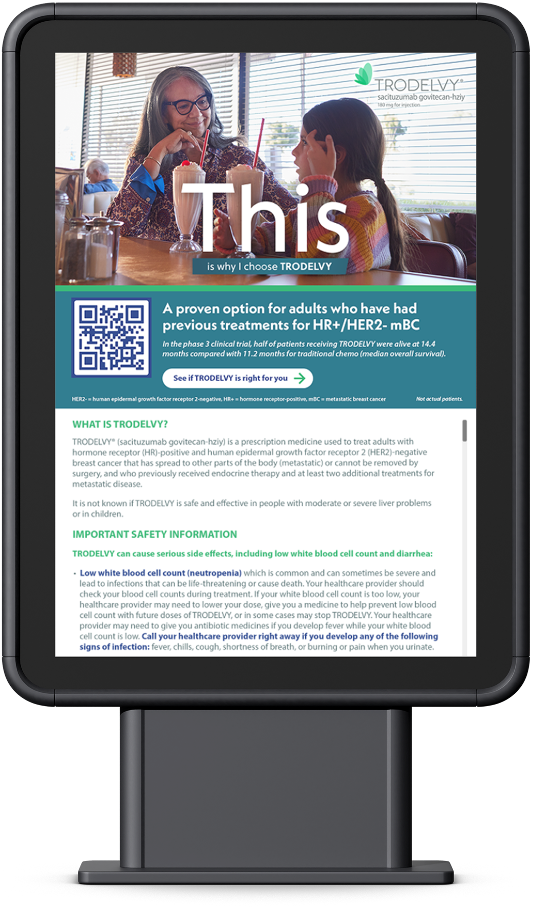 These designs are a part of the campaign titled "This" by Trodelvy, a treatment option offered by a majorpharmaceutical company. They were designed specifically for large interactive touchscreen kiosks in doctor's offices to educate and inform. A tablet mockup is provided for environmental context, though a tablet was not the intended device for the advertisements.